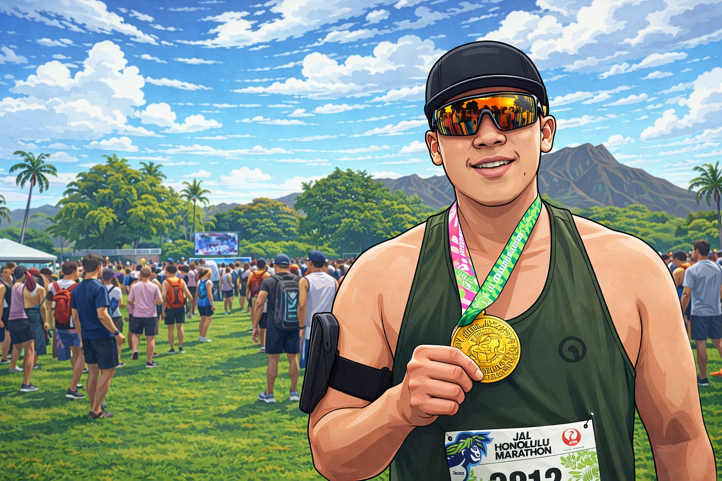 首场的成绩是5个小时2分钟, 离我原本的目标慢了2分钟. 我是在最后2公里争取过的, 可想而知, 最后一段心里有多少不甘. 当然了, 离我真正期待的4小时30分钟, 整整多出了32分钟. Honolulu 马拉松是全美规模最大的全马之一. 2025年, 总共有4万多个人参加, 22721个人完赛; 我的排位是6183, 大约在前28%.