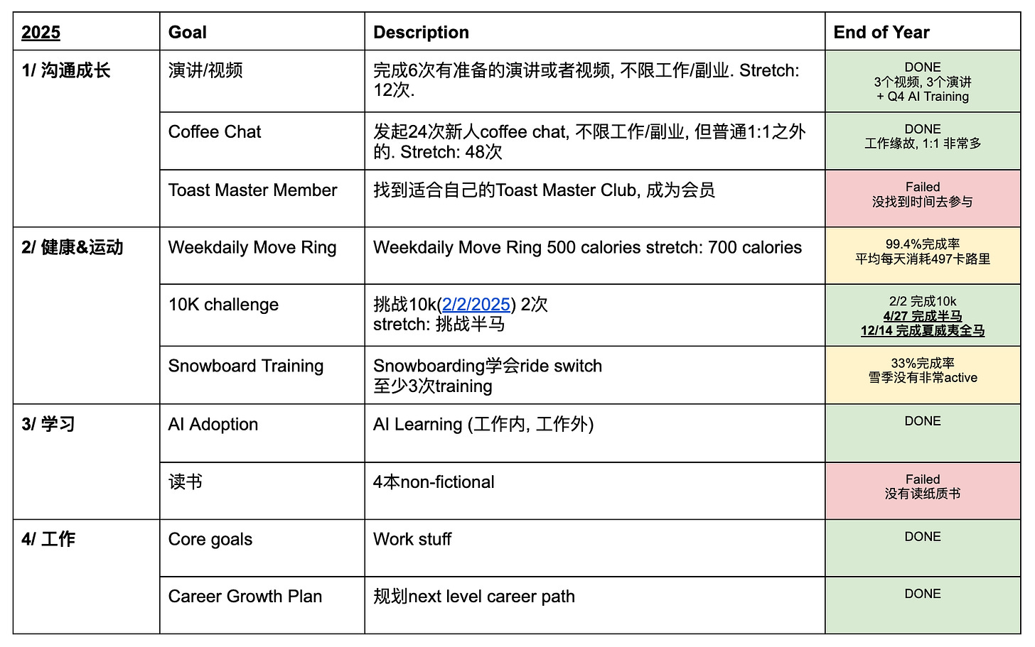 跟2025年1月1日期待的一样, 过去的12个月我过得比往年要充实得多. 在2025 开始的时候, 我做了一个 12 weeks year 的计划. 计划的理念是: “忘掉传统意义上的一年结束是12月31日,把12周当做一年. 因为只有12周去完成目标, 所以需要满打满算, 让能安排的时间都更有价值”. 把12个月的计划融进12周, 原本就是非常难完成的; 但是缩短的12星期, 让这些计划更加容易执行.