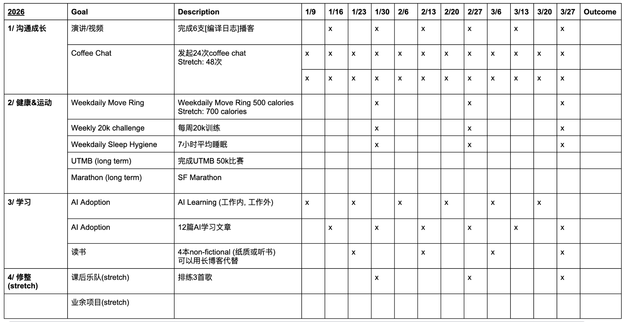 2026的计划里, 我把工作那一栏去掉了. 工作的计划太复杂, 又不适合拿出来写, 干脆去掉. 新的计划, 大致分这个四个部分: