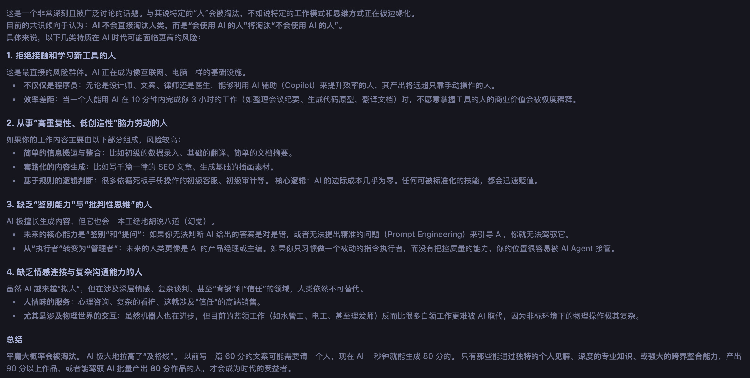 我在没有输出观点的前提下, 单独问了Antigravity和Gemini: “什么人会被AI所淘汰“. 他们的答案都提到了我上面的观点: “拒绝接触和学习新工具的人”会被淘汰. 当然了, 这也可能是Google故意这么说的, 我不就继续用这些AI产品了么哈哈. 下面是AI的回答: