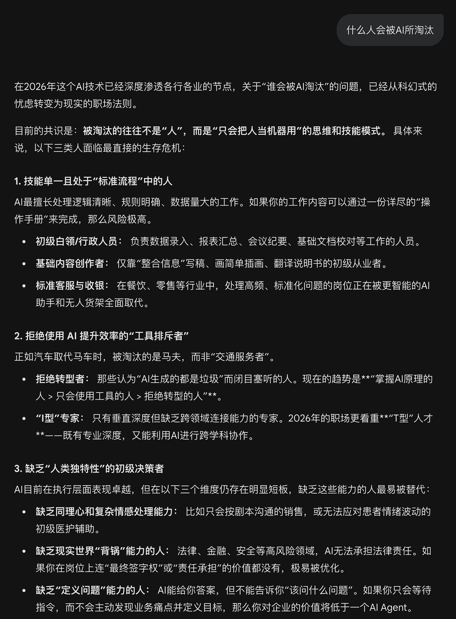 Gemini说: 在2026年这个AI技术已经深度渗透各行各业的节点,关于“谁会被AI淘汰”的问题,已经从科幻式的忧虑转变为现实的职场法则。目前的共识是:被淘汰的往往不是“人”,而是“只会把人当机器用”的思维和技能模式。 具体来说,以下三类人面临最直接的生存危机: